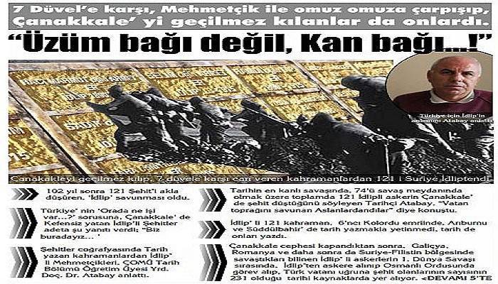 Tarihin en kanlı savaşında, 74'ü savaş meydanında olmak üzere toplamda 121 İdlipli askerin Çanakkale’ de şehit düştüğünü söyleyen Tarihçi Atabay, “Vatan toprağını savunan Aslanlardandılar” diye konuştu.
