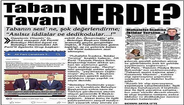 Gazeteniz Vitamin’ in, dünkü manşeti AK Partili Belediye Meclisi üyesi ve Belediye Meclisindeki AK Parti’li üyelerin Grup başkanvekili Av. Ömercioğlu’ yla , Belediye Başkanı Gökhan arasında geçen gerginliğe ilişkin, İl Teşkilatından gelen tepkiyi, az ve yetersiz bulan AK Parti tabanının sesi olmuştu.