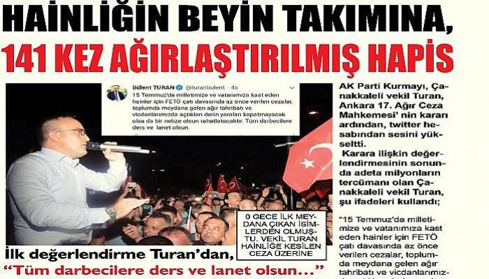 Çanakkale Milletvekili Av. Turan; “15 Temmuz'da milletimize ve vatanımıza kast eden hainler için FETÖ çatı davasında az önce verilen cezalar, toplumda meydana gelen ağır tahribatı ve vicdanlarımızda açtıkları derin yaraları kapatmayacak olsa da bir nebze olsun rahatlatacaktır. Tüm darbecilere ders ve lanet olsun.” dedi.