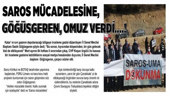 Saros Körfezi’ nin ortağı olan Gelibolu Yarımadası’nın da, öngörülen kirlilikten olumsuz etkileneceğini savunan Göğüsgeren; “Bunun yaşanmaması için, Tarihi yarımadanın, Gelibolu’nun İl Gene Meclis üyeleri Nihat Öner, Ali Rıza Sayın ve Gelibolu yarımadasında kurulu Eceabat ilçemizin İl Genel Meclisi Üyeleri Ali Şinasi Tınaz, Halil Duymaz yanı sıra, Gelibolu İlçe Başkanım İsmail Parlak ile birlikte, ziyaret ettiğimiz alanda gerçekleşen basın açıklamasından sonra alandan ayrıldık.” diyerek, katılımg gösterdikleri ziyarete ilişkin detaylar verdi.