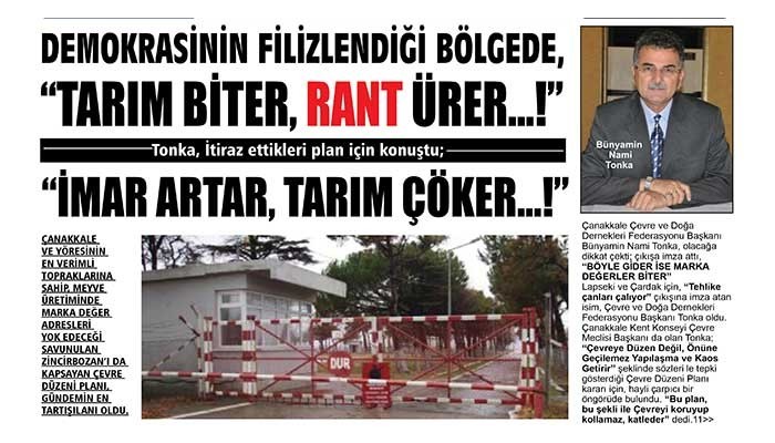 Tonka ardından da şöyle dedi; ”Çanakkale Çevre, Şehircilik ve İklim Değişikliği Müdürlüğü’ nün ilan panosunda yayınlanan, Lapseki ilçesi ile Çardak Belediyelerinin sınırları içinde ve dışında bulunan üç farklı arazinin imara açılması anlamına gelen bu plan, altını önemli çizmek isteriz ki; ‘ÇANAKKALE VE YÖRESİNİN EN VERİMLİ TOPRAKLARINA SAHİP, MEYVE ÜRETİMİNDE MARKA DEĞER ADRESLERİ YOK EDER’ Tarım arazilerinde, meye sebze yerine, lüks villalar, siteler, kısacası yapılar biter..”