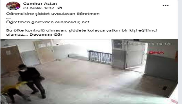 Aksaray'da, bir ortaokulda matematik öğretmeni Ali Rıza Y., koridora çıkardığı öğrencisi T.K.'ya tokat ve yumruk atıp dövdü, boğazını sıktı. Gürültüyü duyan başka sınıftaki öğretmen Gülcan Ünlü, müdahale edip öğrenci T.K.'yı, Ali Rıza Y.'nin elinden kurtardı. O anlar ise güvenlik kamerasına yansıdı.  Güvenlik Kamerası görüntülerin ortaya çıkması ile tepkiler çığ gibi büyüdü. Olaya tepki gösterenlerden biri de gösteren Çomü Sosyoloji Bölümünden Prof. Dr. Cumhur Aslan oldu. Sosyal medya hesabı üzerinden yaptığı paylaşımla, yaşananlara tepki gösteren Aslan, şiddeti uygulayan öğretmenin derhal görevden alınması gerektiğini belirterek   ‘’Öğrencisine şiddet uygulayan öğretmen görevden alınmalıdır, net, Bu öfke kontrolü olmayan, şiddete kolayca yatkın bir kişi eğitimci olamaz. Burada üç aktör var, döven öğretmen, kapıyı açıp kapatan öğretmen ve koşup çocuğu ‘kurtaran’ öğretmen Kapıyı açıp kapatan öğretmeni de bir eğitimden geçirmek lazım, iyi bir öğretmen olmayabilir. şiddet kendine yetemeyen, güçsüz ve zayıf insanların en büyük gücüdür. Kendisine hakim, öz bilinci yerinde olan ve içindeki şiddet ‘duygularını’ kontrol etmiş insan şiddete başvurmaz. Bir kez Erzurum Oltu'da liseye gitmiştim, bir öğretmen hocam demişti, bazen şiddeti hak ediyorlar. şiddeti hak etmek mümkün müdür, bilmiyorum ama bir insana ‘fiziki şiddet’ şiddetin en basit, en bayağı yönüdür. Bu şahıs gibi belki de onlarca öğretmen var, akademisyen de vardır. Öğrencisini aşağılayan bir akademisyen şiddet uygulamaktadır. Son olarak şiddeti ağırlaştıran en önemli şey asimetrik durumdur. Sizden zayıf veya küçük şeye şiddet uygulayan insanlar genellikle kendilerinden güçlü veya tehlikeli insanlara karşı naziktirler.’’